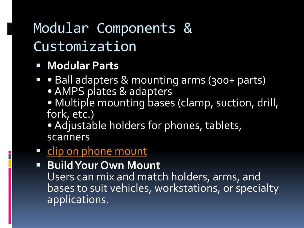 Modular Components & Customization • Modular Parts • • Ball adapters & mounting arms (300+ parts)• AMPS plates & adapters• Multiple mounting bases (clamp, suction, drill, fork, etc.)• Adjustable holders for phones, tablets, scanners • clip on phone mount • Build Your Own MountUsers can mix and match holders, arms, and bases to suit vehicles, workstations, or specialty applications.