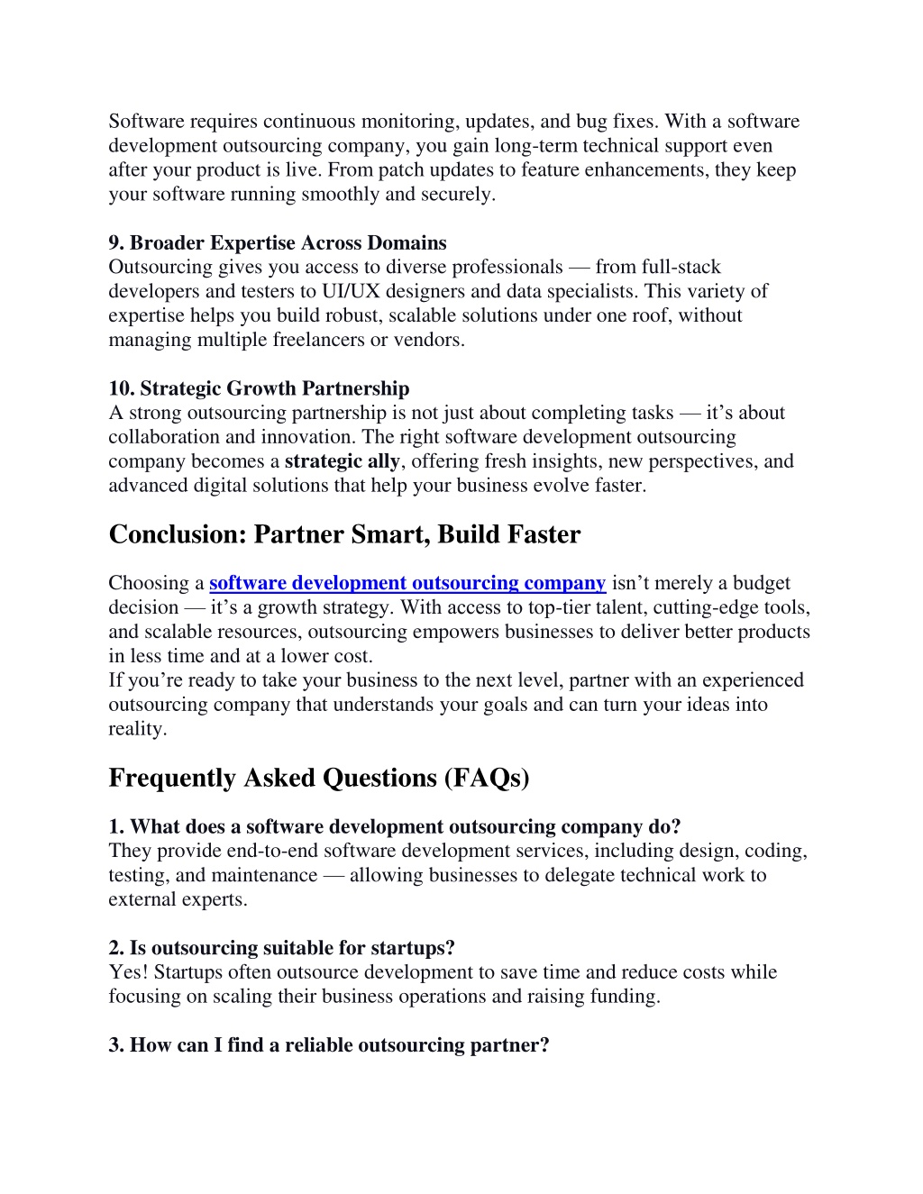 3. Software requires continuous monitoring, updates, and bug fixes. With a software development outsourcing company, you gain long-term technical support even after your product is live. From patch updates to feature enhancements, they keep your software running smoothly and securely. 9. Broader Expertise Across Domains Outsourcing gives you access to diverse professionals — from full-stack developers and testers to UI/UX designers and data specialists. This variety of expertise helps you build robust, scalable solutions under one roof, without managing multiple freelancers or vendors. 10. Strategic Growth Partnership A strong outsourcing partnership is not just about completing tasks —it’s about collaboration and innovation. The right software development outsourcing company becomes a strategic ally, offering fresh insights, new perspectives, and advanced digital solutions that help your business evolve faster. Conclusion: Partner Smart, Build Faster Choosing a software development outsourcing companyisn’t merely a budget decision —it’s a growth strategy. With access to top-tier talent, cutting-edge tools, and scalable resources, outsourcing empowers businesses to deliver better products in less time and at a lower cost. If you’re ready to take your business to the next level, partner with an experienced outsourcing company that understands your goals and can turn your ideas into reality. Frequently Asked Questions (FAQs) 1. What does a software development outsourcing company do? They provide end-to-end software development services, including design, coding, testing, and maintenance — allowing businesses to delegate technical work to external experts. 2. Is outsourcing suitable for startups? Yes! Startups often outsource development to save time and reduce costs while focusing on scaling their business operations and raising funding. 3. How can I find a reliable outsourcing partner?