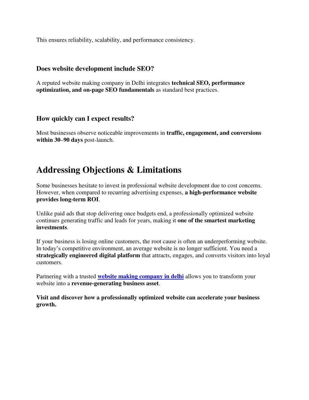 This ensures reliability, scalability, and performance consistency. Does website development include SEO? A reputed website making company in Delhi integrates technical SEO, performance optimization, and on-page SEO fundamentals as standard best practices. How quickly can I expect results? Most businesses observe noticeable improvements in traffic, engagement, and conversions within 30–90 days post-launch. Addressing Objections & Limitations Some businesses hesitate to invest in professional website development due to cost concerns. However, when compared to recurring advertising expenses, a high-performance website provides long-term ROI. Unlike paid ads that stop delivering once budgets end, a professionally optimized website continues generating traffic and leads for years, making it one of the smartest marketing investments. If your business is losing online customers, the root cause is often an underperforming website. In today’s competitive environment, an average website is no longer sufficient. You need a strategically engineered digital platform that attracts, engages, and converts visitors into loyal customers. Partnering with a trusted website making company in delhi allows you to transform your website into a revenue-generating business asset. Visit anddiscover how a professionally optimized website can accelerate your business growth.