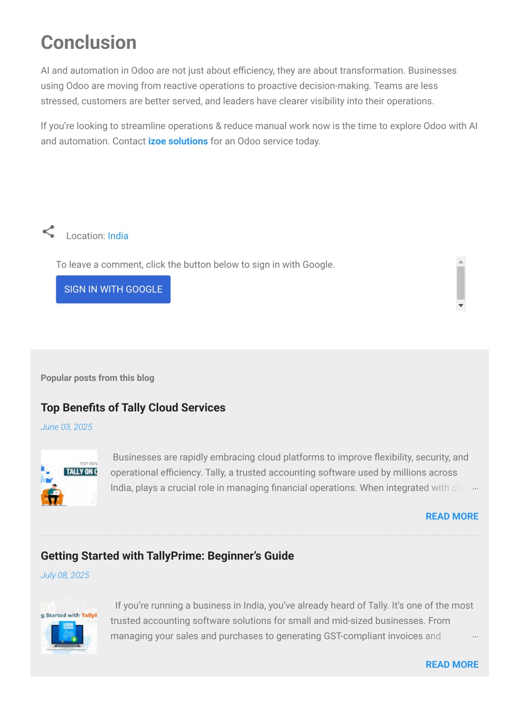 Conclusion AI and automation in Odoo are not just about e?ciency, they are about transformation. Businesses using Odoo are moving from reactive operations to proactive decision-making. Teams are less stressed, customers are better served, and leaders have clearer visibility into their operations. If you’re looking to streamline operations & reduce manual work now is the time to explore Odoo with AI and automation. Contact izoe solutions for an Odoo service today. Location: India To leave a comment, click the button below to sign in with Google. SIGN IN WITH GOOGLE Popular posts from this blog Top Bene?ts of Tally Cloud Services June 03, 2025 Businesses are rapidly embracing cloud platforms to improve ?exibility, security, and operational e?ciency. Tally, a trusted accounting software used by millions across India, plays a crucial role in managing ?nancial operations. When integrated with cloud… READ MORE Getting Started with TallyPrime: Beginner’s Guide July 08, 2025 If you’re running a business in India, you’ve already heard of Tally. It’s one of the most trusted accounting software solutions for small and mid-sized businesses. From … managing your sales and purchases to generating GST-compliant invoices and READ MORE