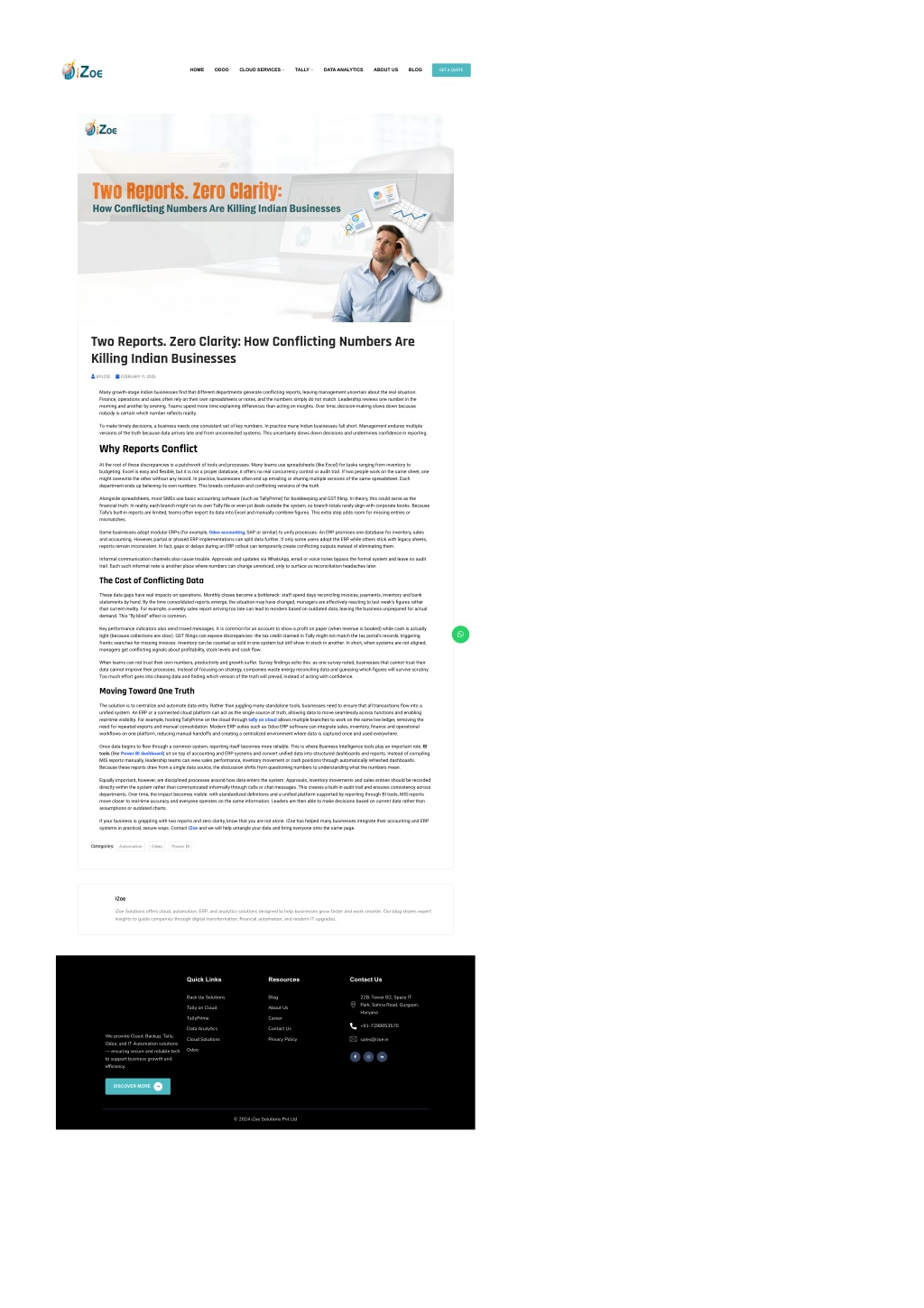 GET A QUOTE HOME ODOO CLOUD SERVICES TALLY DATA ANALYTICS ABOUT US BLOG Two Reports. Zero Clarity: How Conflicting Numbers Are Killing Indian Businesses BY:IZOE FEBRUARY 11, 2026 Many growth-stage Indian businesses ?nd that different departments generate con?icting reports, leaving management uncertain about the real situation. Finance, operations and sales often rely on their own spreadsheets or notes, and the numbers simply do not match. Leadership reviews one number in the morning and another by evening. Teams spend more time explaining differences than acting on insights. Over time, decision-making slows down because nobody is certain which number re?ects reality. To make timely decisions, a business needs one consistent set of key numbers. In practice many Indian businesses fall short. Management endures multiple versions of the truth because data arrives late and from unconnected systems. This uncertainty slows down decisions and undermines con?dence in reporting. Why Reports Conflict At the root of these discrepancies is a patchwork of tools and processes. Many teams use spreadsheets (like Excel) for tasks ranging from inventory to budgeting. Excel is easy and ?exible, but it is not a proper database, it offers no real concurrency control or audit trail. If two people work on the same sheet, one might overwrite the other without any record. In practice, businesses often end up emailing or sharing multiple versions of the same spreadsheet. Each department ends up believing its own numbers. This breeds confusion and con?icting versions of the truth. Alongside spreadsheets, most SMEs use basic accounting software (such as TallyPrime) for bookkeeping and GST ?ling. In theory, this could serve as the ?nancial truth. In reality, each branch might run its own Tally ?le or even jot deals outside the system, so branch totals rarely align with corporate books. Because Tally’s built-in reports are limited, teams often export its data into Excel and manually combine ?gures. This extra step adds room for missing entries or mismatches. Some businesses adopt modular ERPs (for example, Odoo accounting, SAP or similar) to unify processes. An ERP promises one database for inventory, sales and accounting. However, partial or phased ERP implementations can split data further. If only some users adopt the ERP while others stick with legacy sheets, reports remain inconsistent. In fact, gaps or delays during an ERP rollout can temporarily create con?icting outputs instead of eliminating them. Informal communication channels also cause trouble. Approvals and updates via WhatsApp, email or voice notes bypass the formal system and leave no audit trail. Each such informal note is another place where numbers can change unnoticed, only to surface as reconciliation headaches later. The Cost of Conflicting Data These data gaps have real impacts on operations. Monthly closes become a bottleneck: staff spend days reconciling invoices, payments, inventory and bank statements by hand. By the time consolidated reports emerge, the situation may have changed; managers are effectively reacting to last week’s ?gures rather than current reality. For example, a weekly sales report arriving too late can lead to reorders based on outdated data, leaving the business unprepared for actual demand. This “?y blind” effect is common. Key performance indicators also send mixed messages. It is common for an account to show a pro?t on paper (when revenue is booked) while cash is actually tight (because collections are slow). GST ?lings can expose discrepancies: the tax credit claimed in Tally might not match the tax portal’s records, triggering frantic searches for missing invoices. Inventory can be counted as sold in one system but still show in stock in another. In short, when systems are not aligned, managers get con?icting signals about pro?tability, stock levels and cash ?ow. When teams can not trust their own numbers, productivity and growth suffer. Survey ?ndings echo this: as one survey noted, businesses that cannot trust their data cannot improve their processes. Instead of focusing on strategy, companies waste energy reconciling data and guessing which ?gures will survive scrutiny. Too much effort goes into chasing data and ?nding which version of the truth will prevail, instead of acting with con?dence. Moving Toward One Truth The solution is to centralize and automate data entry. Rather than juggling many standalone tools, businesses need to ensure that all transactions ?ow into a uni?ed system. An ERP or a connected cloud platform can act as the single source of truth, allowing data to move seamlessly across functions and enabling real-time visibility. For example, hosting TallyPrime on the cloud through tally on cloud allows multiple branches to work on the same live ledger, removing the need for repeated exports and manual consolidation. Modern ERP suites such as Odoo ERP software can integrate sales, inventory, ?nance and operational work?ows on one platform, reducing manual handoffs and creating a centralized environment where data is captured once and used everywhere. Once data begins to ?ow through a common system, reporting itself becomes more reliable. This is where Business Intelligence tools play an important role. BI tools (like Power BI dashboard) sit on top of accounting and ERP systems and convert uni?ed data into structured dashboards and reports. Instead of compiling MIS reports manually, leadership teams can view sales performance, inventory movement or cash positions through automatically refreshed dashboards. Because these reports draw from a single data source, the discussion shifts from questioning numbers to understanding what the numbers mean. Equally important, however, are disciplined processes around how data enters the system. Approvals, inventory movements and sales entries should be recorded directly within the system rather than communicated informally through calls or chat messag