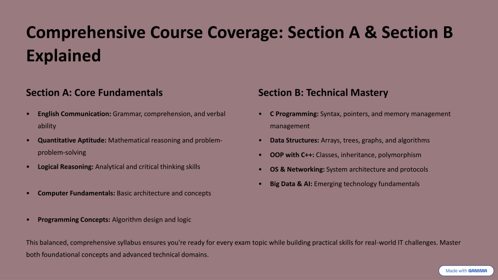 Comprehensive Course Coverage: Section A & Section B Explained Section A: Core Fundamentals Section B: Technical Mastery English Communication: Grammar, comprehension, and verbal ability C Programming: Syntax, pointers, and memory management Quantitative Aptitude: Mathematical reasoning and problem-solving Data Structures: Arrays, trees, graphs, and algorithms OOP with C++: Classes, inheritance, polymorphism Logical Reasoning: Analytical and critical thinking skills OS & Networking: System architecture and protocols Big Data & AI: Emerging technology fundamentals Computer Fundamentals: Basic architecture and concepts Programming Concepts: Algorithm design and logic This balanced, comprehensive syllabus ensures you're ready for every exam topic while building practical skills for real-world IT challenges. Master both foundational concepts and advanced technical domains.