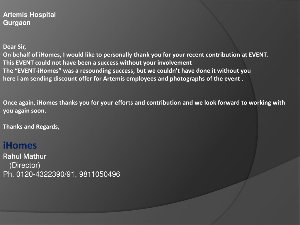 Artemis Hospital Gurgaon Dear Sir, On behalf of iHomes , I would like to personally thank you for your recent contribution at EVENT. This EVENT could not have been a success without your involvement The “EVENT- iHomes ” was a resounding success, but we couldn’t have done it without you
