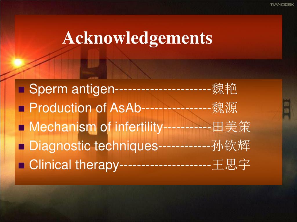 Acknowledgements • Sperm antigen----------------------魏艳 • Production of AsAb----------------魏源 • Mechanism of infertility-----------田美策 • Diagnostic techniques------------孙钦辉 • Clinical therapy---------------------王思宇