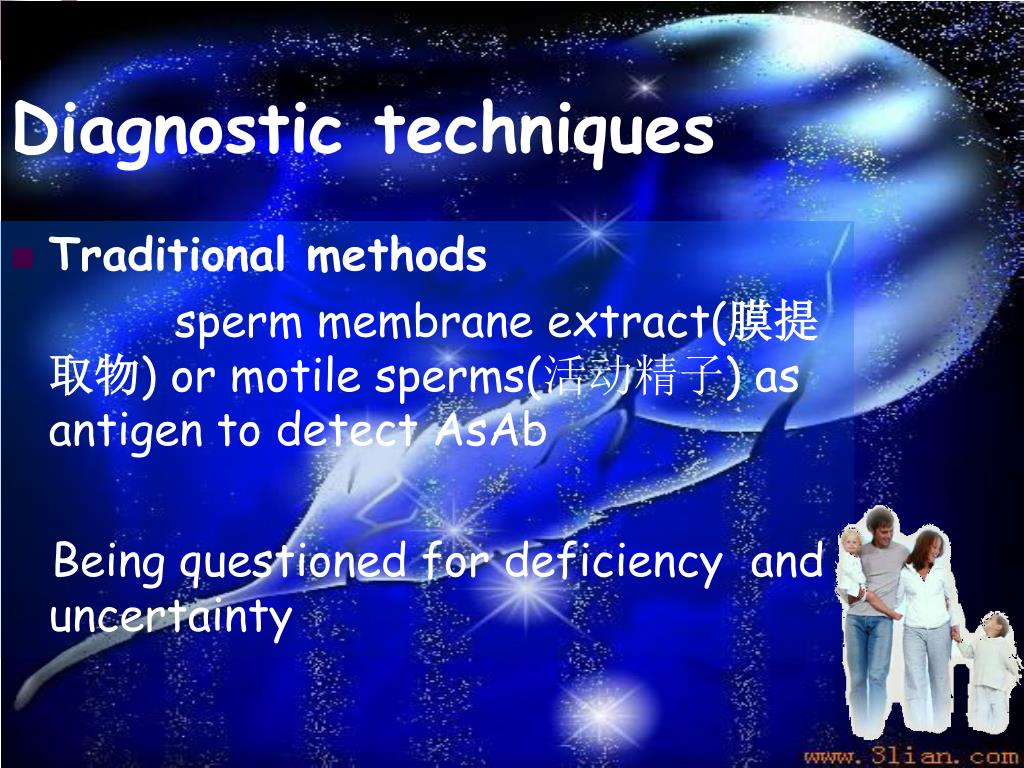 Diagnostic techniques Traditional methods sperm membrane extract(膜提取物) or motile sperms(活动精子) as antigen to detect AsAb Being questioned for deficiency and uncertainty