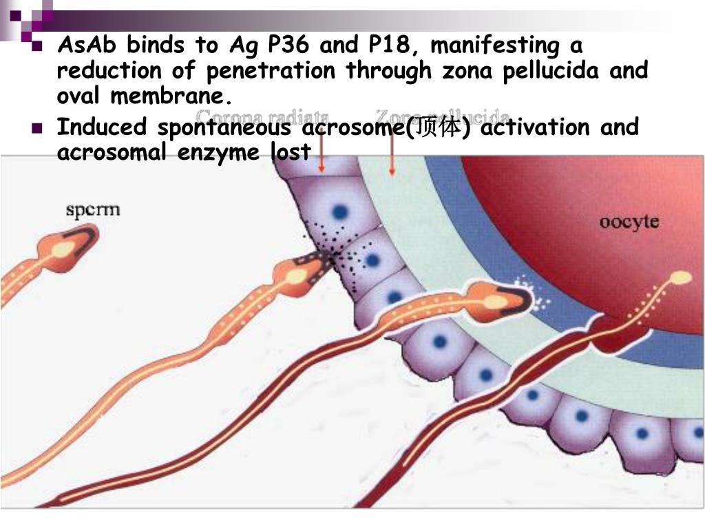 AsAb binds to Ag P36 and P18, manifesting a reduction of penetration through zona pellucida and oval membrane. Induced spontaneous acrosome(顶体) activation and acrosomal enzyme lost