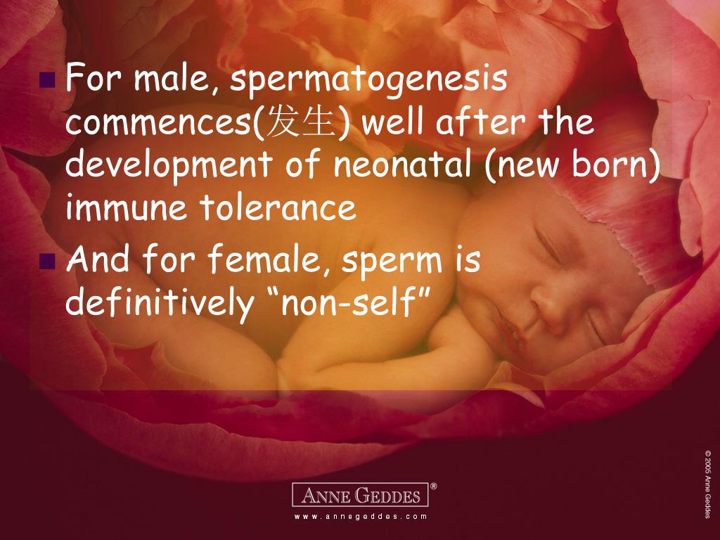 For male, spermatogenesis commences(发生) well after the development of neonatal (new born) immune tolerance • And for female, sperm is definitively “non-self”
