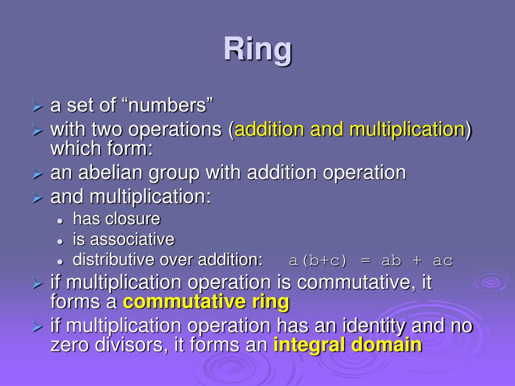 Ring • a set of “numbers” • with two operations (addition and multiplication) which form: • an abelian group with addition operation • and multiplication: • has closure • is associative • distributive over addition: a(b+c) = ab + ac • if multiplication operation is commutative, it forms a commutative ring • if multiplication operation has an identity and no zero divisors, it forms an integral domain