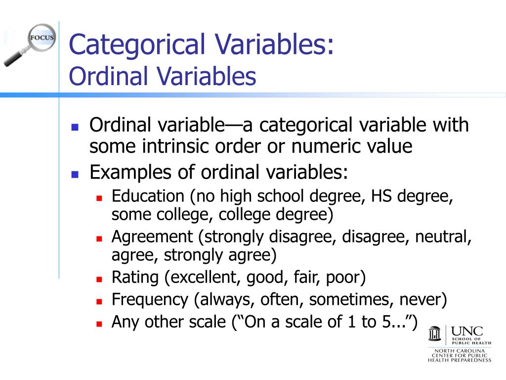 Categorical Variables:Ordinal Variables • Ordinal variable—a categorical variable with some intrinsic order or numeric value • Examples of ordinal variables: • Education (no high school degree, HS degree, some college, college degree) • Agreement (strongly disagree, disagree, neutral, agree, strongly agree) • Rating (excellent, good, fair, poor) • Frequency (always, often, sometimes, never) • Any other scale (“On a scale of 1 to 5...”)