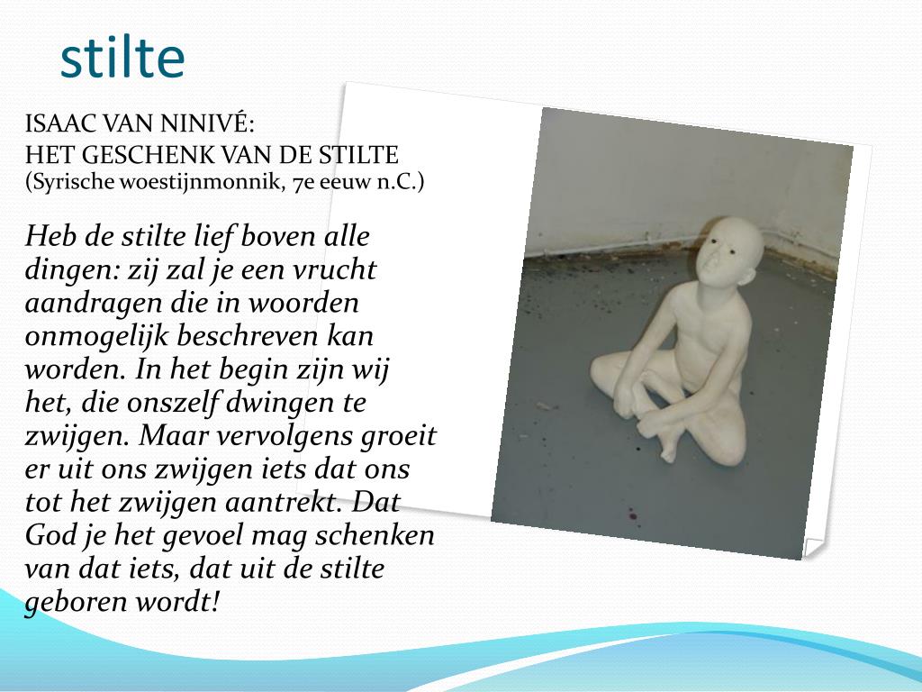 stilte ISAAC VAN NINIVÉ: HET GESCHENK VAN DE STILTE(Syrische woestijnmonnik, 7e eeuw n.C.) Heb de stilte lief boven alle dingen: zij zal je een vrucht aandragen die in woorden onmogelijk beschreven kan worden. In het begin zijn wij het, die onszelf dwingen te zwijgen. Maar vervolgens groeit er uit ons zwijgen iets dat ons tot het zwijgen aantrekt. Dat God je het gevoel mag schenken van dat iets, dat uit de stilte geboren wordt!