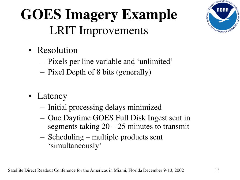 GOES Imagery ExampleLRIT Improvements • Resolution • Pixels per line variable and ‘unlimited’ • Pixel Depth of 8 bits (generally) • Latency • Initial processing delays minimized • One Daytime GOES Full Disk Ingest sent in segments taking 20 – 25 minutes to transmit • Scheduling – multiple products sent ‘simultaneously’ 15 Satellite Direct Readout Conference for the Americas in Miami, Florida December 9-13, 2002