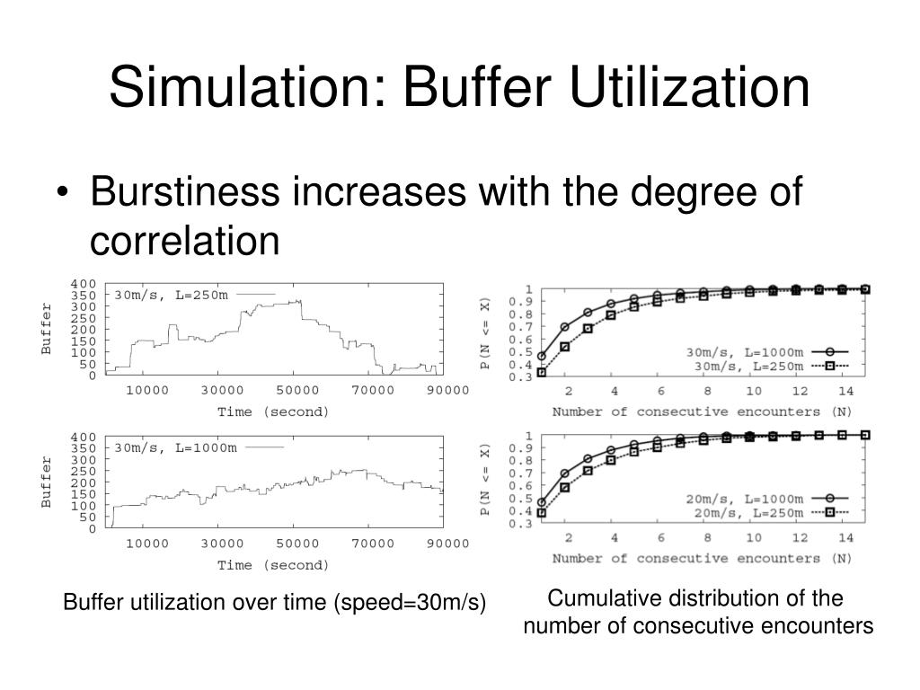 Simulation: Buffer Utilization • Burstiness increases with the degree of correlation Cumulative distribution of the number of consecutiveencounters Buffer utilization over time (speed=30m/s)
