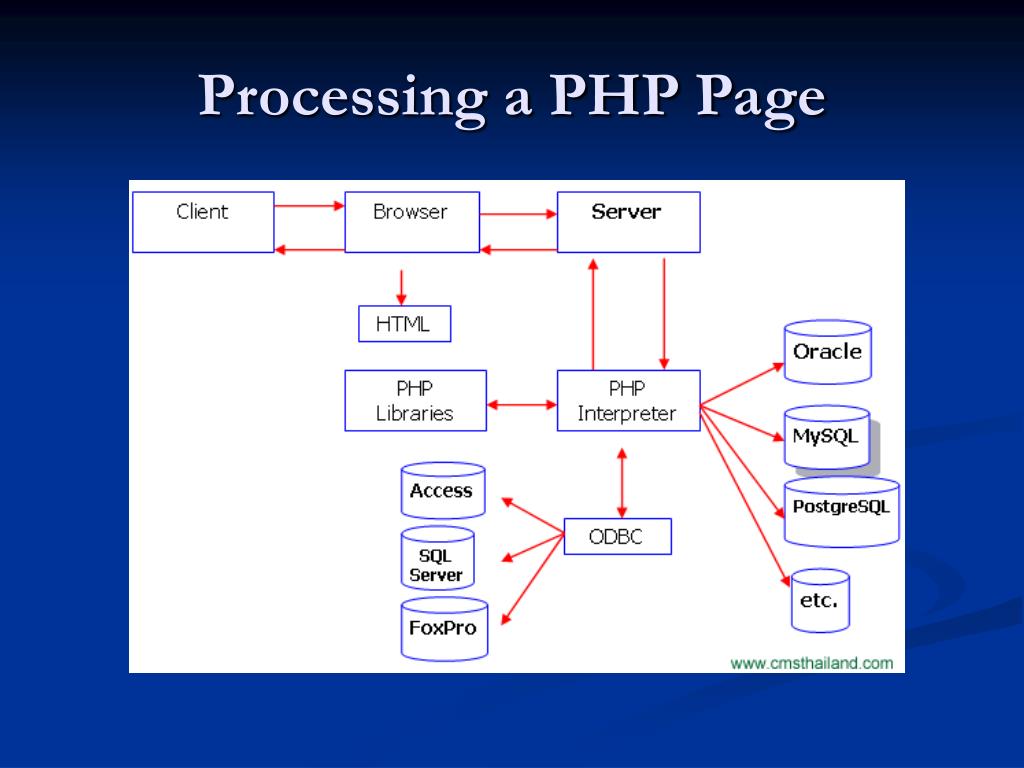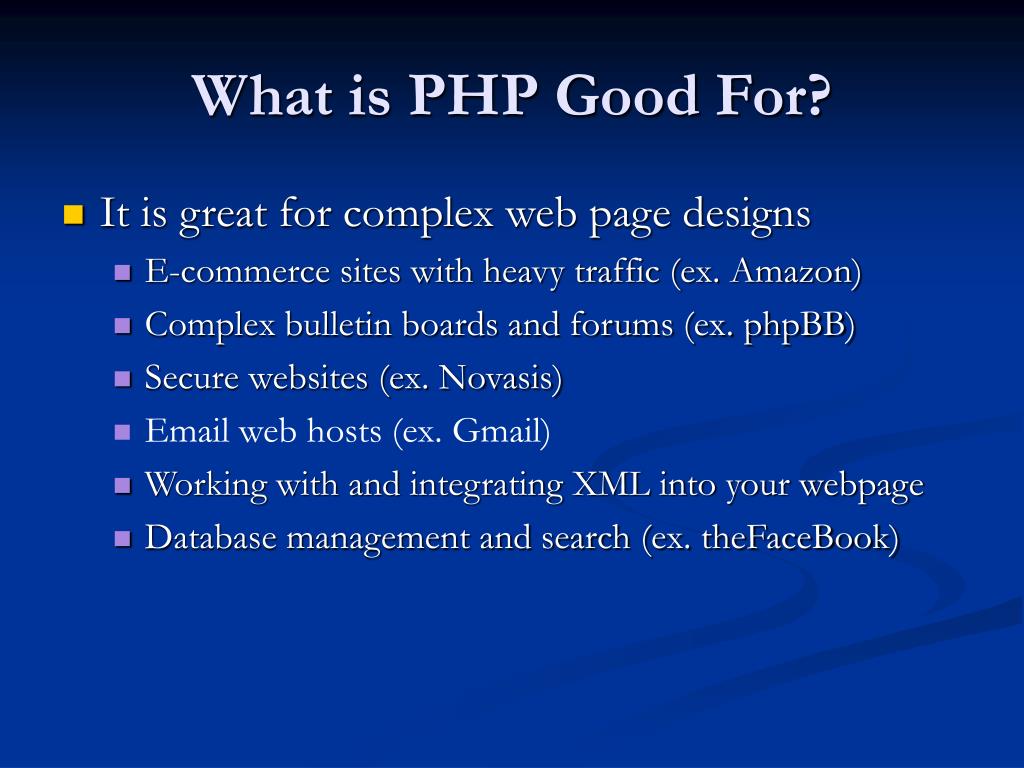 What is PHP Good For? • It is great for complex web page designs • E-commerce sites with heavy traffic (ex. Amazon) • Complex bulletin boards and forums (ex. phpBB) • Secure websites (ex. Novasis) • Email web hosts (ex. Gmail) • Working with and integrating XML into your webpage • Database management and search (ex. theFaceBook)