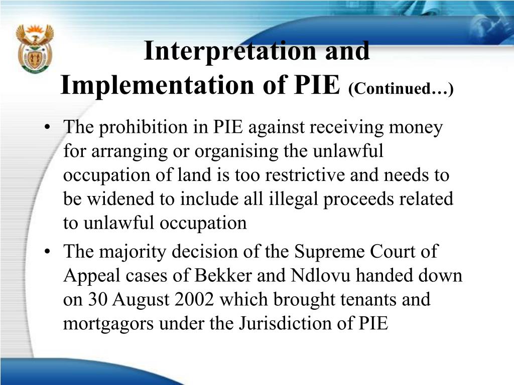 Interpretation and Implementation of PIE (Continued…) • The prohibition in PIE against receiving money for arranging or organising the unlawful occupation of land is too restrictive and needs to be widened to include all illegal proceeds related to unlawful occupation • The majority decision of the Supreme Court of Appeal cases of Bekker and Ndlovu handed down on 30 August 2002 which brought tenants and mortgagors under the Jurisdiction of PIE