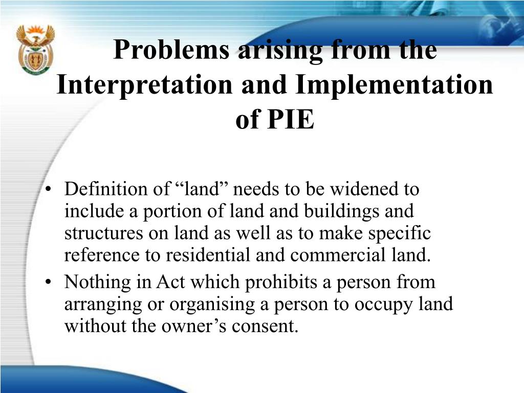 Problems arising from the Interpretation and Implementation of PIE • Definition of “land” needs to be widened to include a portion of land and buildings and structures on land as well as to make specific reference to residential and commercial land. • Nothing in Act which prohibits a person from arranging or organising a person to occupy land without the owner’s consent.
