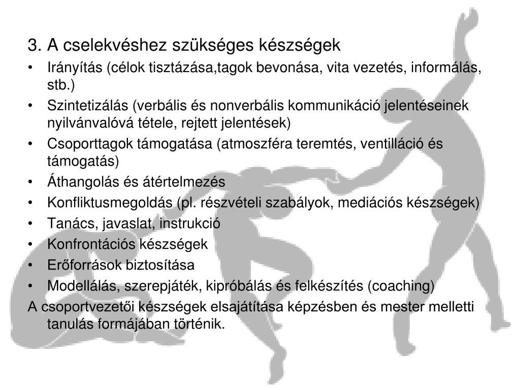 3. A cselekvéshez szükséges készségek • Irányítás (célok tisztázása,tagok bevonása, vita vezetés, informálás, stb.) • Szintetizálás (verbális és nonverbális kommunikáció jelentéseinek nyilvánvalóvá tétele, rejtett jelentések) • Csoporttagok támogatása (atmoszféra teremtés, ventilláció és támogatás) • Áthangolás és átértelmezés • Konfliktusmegoldás (pl. részvételi szabályok, mediációs készségek) • Tanács, javaslat, instrukció • Konfrontációs készségek • Erőforrások biztosítása • Modellálás, szerepjáték, kipróbálás és felkészítés (coaching) A csoportvezetői készségek elsajátítása képzésben és mester melletti tanulás formájában történik.
