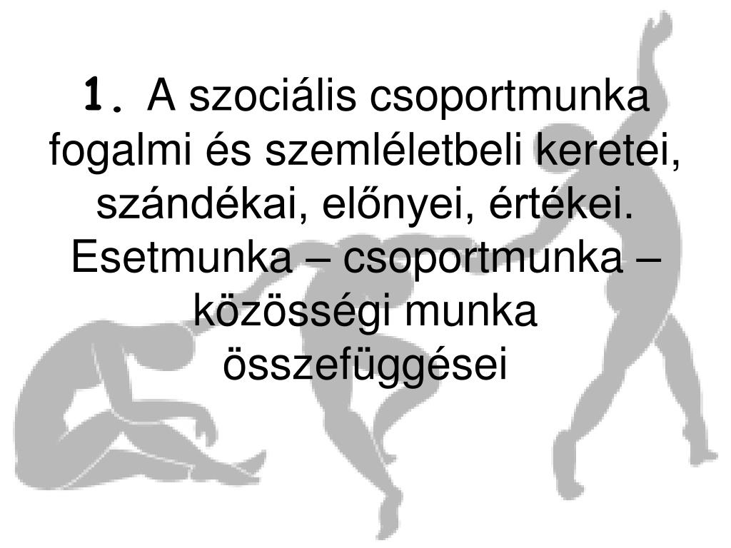 1. A szociális csoportmunka fogalmi és szemléletbeli keretei, szándékai, előnyei, értékei. Esetmunka – csoportmunka – közösségi munka összefüggései