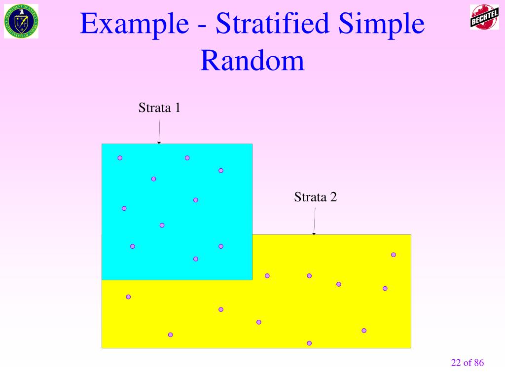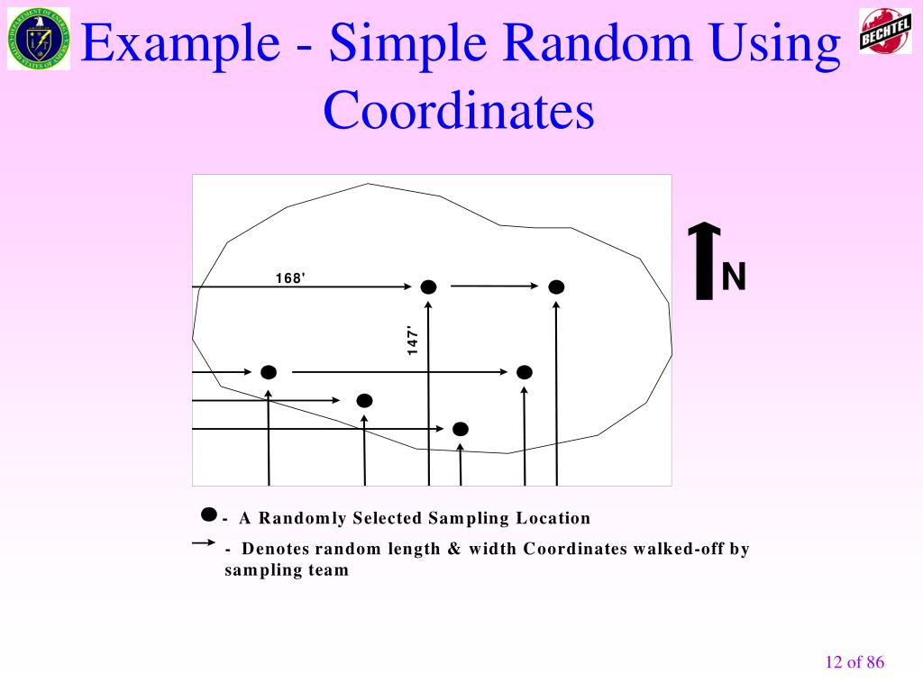 Simple Random • To generate a simple random design: • Either grid the site - set up equal lateral triangles or equal side rectangles and number each grid, use a random number generator to pick the grids from which to collect samples • Randomly select x, y, z coordinates, go to the random coordinates and collect samples