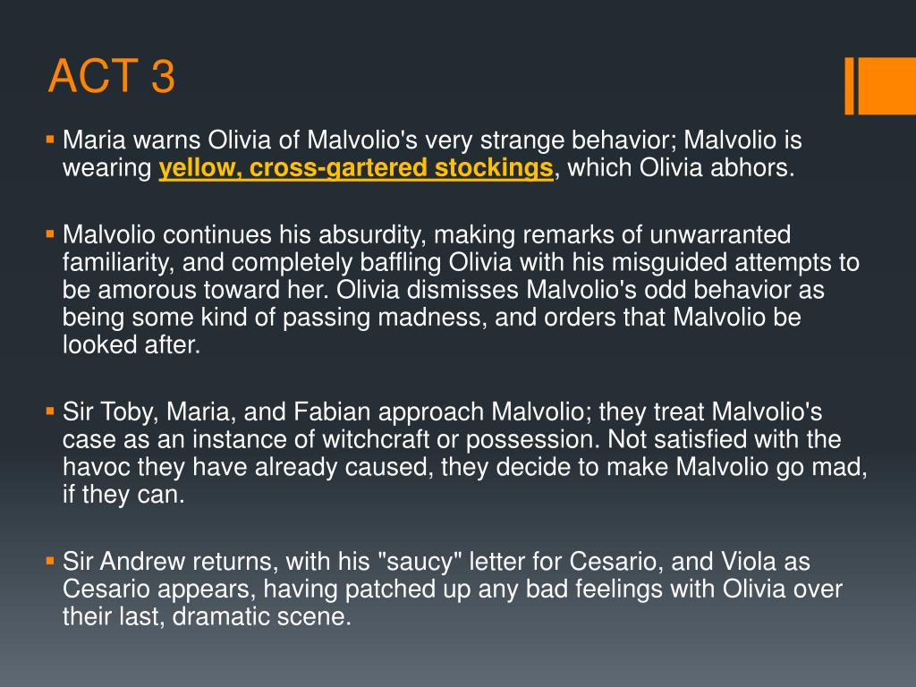 ACT 3 • Maria warns Olivia of Malvolio's very strange behavior; Malvolio is wearing yellow, cross-gartered stockings, which Olivia abhors. • Malvoliocontinues his absurdity, making remarks of unwarranted familiarity, and completely baffling Olivia with his misguided attempts to be amorous toward her. Olivia dismisses Malvolio's odd behavior as being some kind of passing madness, and orders that Malvolio be looked after. • Sir Toby, Maria, and Fabian approach Malvolio; they treat Malvolio's case as an instance of witchcraft or possession. Not satisfied with the havoc they have already caused, they decide to make Malvolio go mad, if they can. • Sir Andrew returns, with his "saucy" letter for Cesario, and Viola as Cesario appears, having patched up any bad feelings with Olivia over their last, dramatic scene.