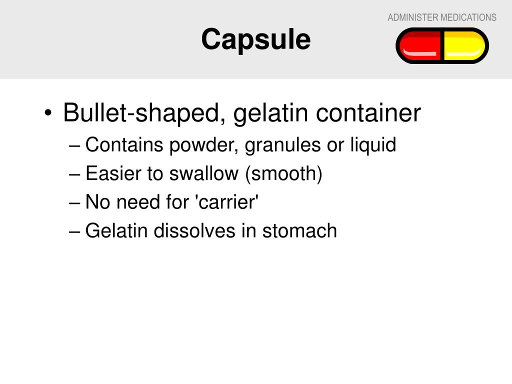 Capsule • Bullet-shaped, gelatin container • Contains powder, granules or liquid • Easier to swallow (smooth) • No need for 'carrier' • Gelatin dissolves in stomach