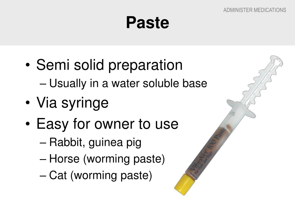 Paste • Semi solid preparation • Usually in a water soluble base • Via syringe • Easy for owner to use • Rabbit, guinea pig • Horse (worming paste) • Cat (worming paste)