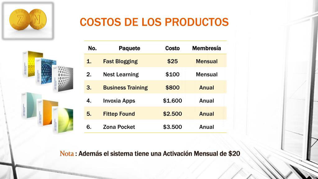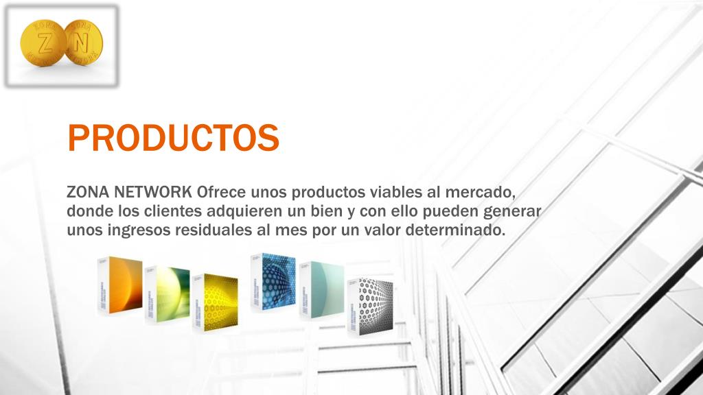 PRODUCTOS ZONA NETWORK Ofrece unos productos viables al mercado, donde los clientes adquieren un bien y con ello pueden generar unos ingresos residuales al mes por un valor determinado.