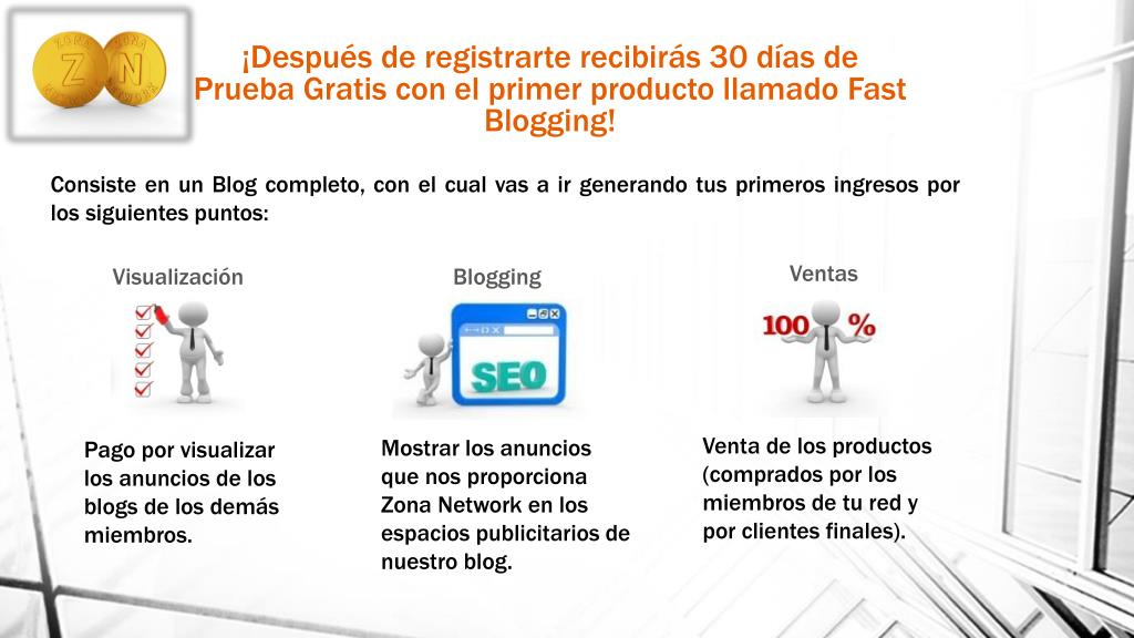 ¡Después de registrarte recibirás 30 días de Prueba Gratis con el primer producto llamado FastBlogging! Consiste en un Blog completo, con el cual vas a ir generando tus primeros ingresos por los siguientes puntos: Visualización Blogging Ventas Venta de los productos (comprados por los miembros de tu red y por clientes finales). Mostrar los anuncios que nos proporciona Zona Network en los espacios publicitarios de nuestro blog. Pago por visualizar los anuncios de los blogs de los demás miembros.