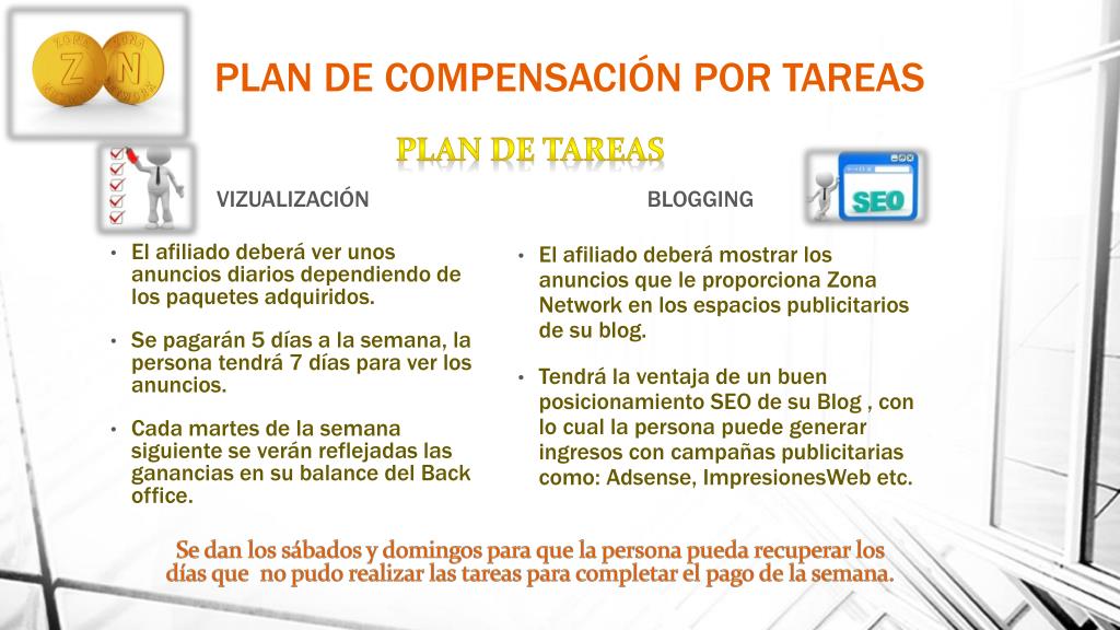 PLAN DE COMPENSACIÓN POR TAREAS PLAN DE TAREAS VIZUALIZACIÓN BLOGGING El afiliado deberá mostrar los anuncios que le proporciona Zona Network en los espacios publicitarios de su blog. Tendrá la ventaja de un buen posicionamiento SEO de su Blog , con lo cual la persona puede generar ingresos con campañas publicitarias como: Adsense, ImpresionesWeb etc. • El afiliado deberá ver unos anuncios diarios dependiendo de los paquetes adquiridos. • Se pagarán 5 días a la semana, la persona tendrá 7 días para ver los anuncios. • Cada martes de la semana siguiente se verán reflejadas las ganancias en su balance del Back office. Se dan los sábados y domingos para que la persona pueda recuperar los días que no pudo realizar las tareas para completar el pago de la semana.