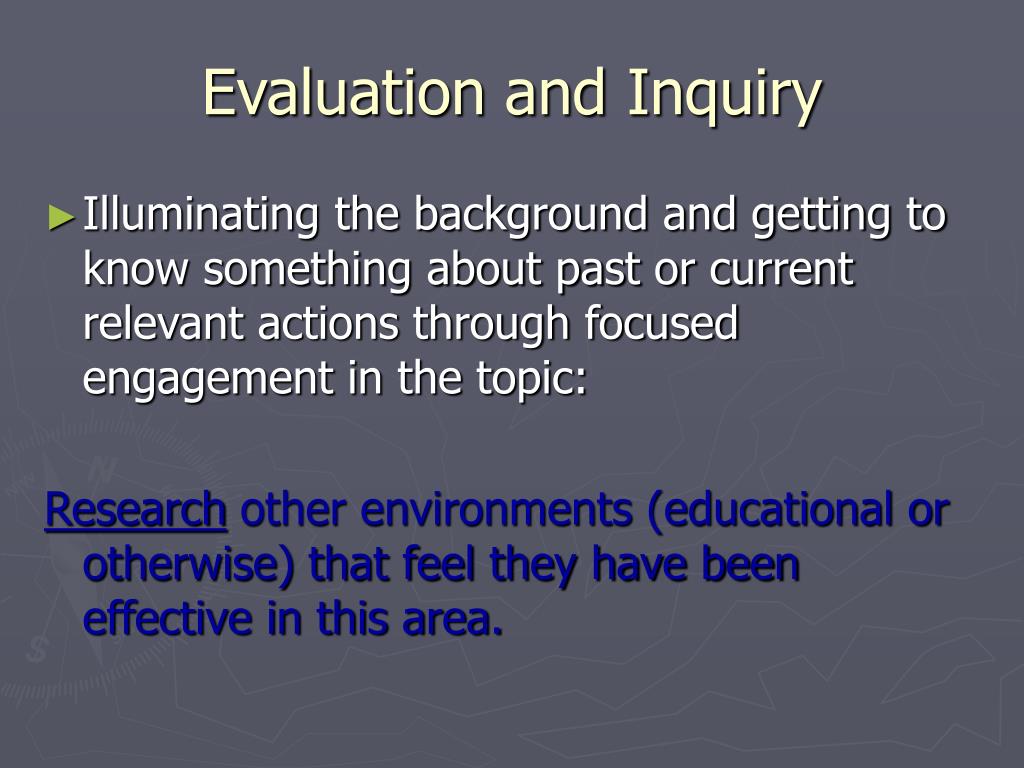Evaluation and Inquiry • Illuminating the background and getting to know something about past or current relevant actions through focused engagement in the topic: Research other environments (educational or otherwise) that feel they have been effective in this area.
