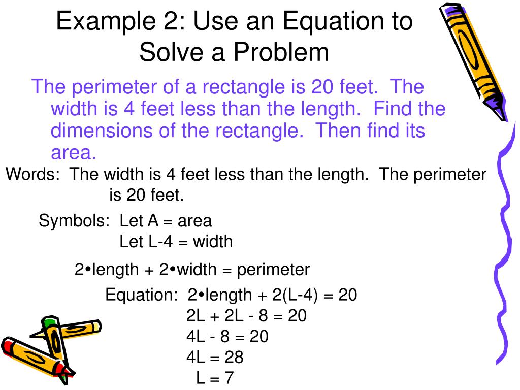 Example 2: Use an Equation to Solve a Problem The perimeter of a rectangle is 20 feet. The width is 4 feet less than the length. Find the dimensions of the rectangle. Then find its area. Words: The width is 4 feet less than the length. The perimeter is 20 feet. Symbols: Let A = area Let L-4 = width 2length + 2width = perimeter Equation: 2length + 2(L-4) = 20 2L + 2L - 8 = 20 4L - 8 = 20 4L = 28 L = 7