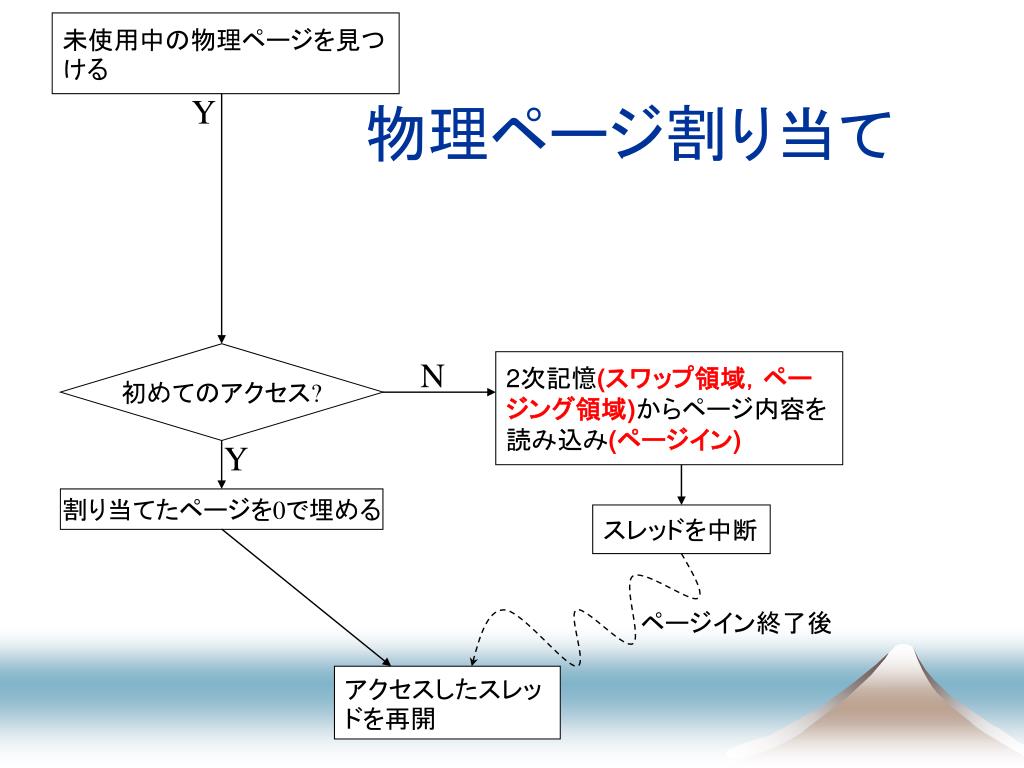 未使用中の物理ページを見つける 物理ページ割り当て Y ファイルマップされた領域? 対応するファイルからページ内容を読み込み(ページイン) Y 初めてのアクセス? N 2次記憶(スワップ領域,ページング領域)からページ内容を読み込み(ページイン) Y 割り当てたページを0で埋める スレッドを中断 ページイン終了後 アクセスしたスレッドを再開
