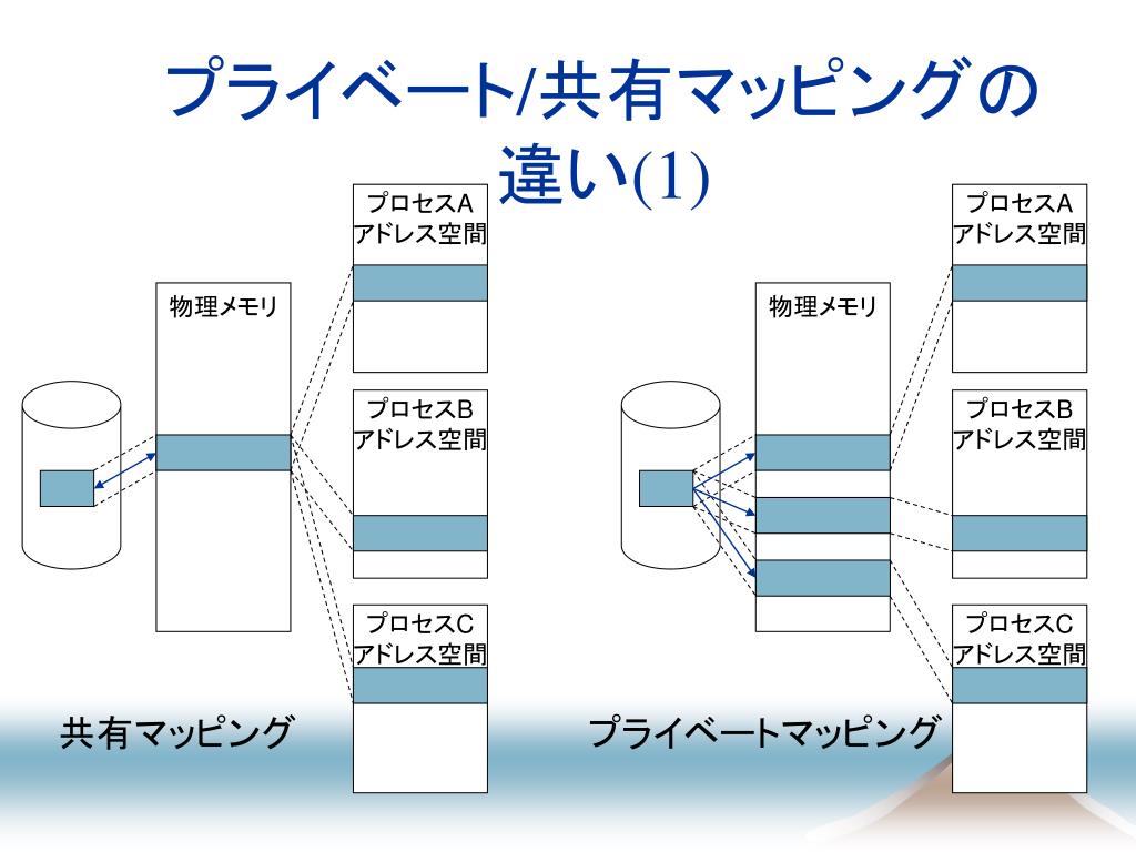 プライベート/共有マッピングの違い(1) プロセスA アドレス空間 プロセスA アドレス空間 物理メモリ 物理メモリ プロセスB アドレス空間 プロセスB アドレス空間 プロセスC アドレス空間 プロセスC アドレス空間 共有マッピング プライベートマッピング