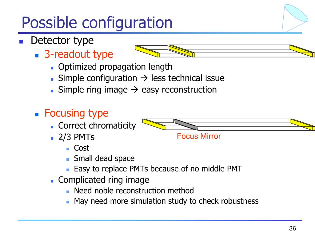 Focus Mirror Possible configuration • Detector type • 3-readout type • Optimized propagation length • Simple configuration less technical issue • Simple ring image easy reconstruction • Focusing type • Correct chromaticity • 2/3 PMTs • Cost • Small dead space • Easy to replace PMTs because of no middle PMT • Complicated ring image • Need noble reconstruction method • May need more simulation study to check robustness
