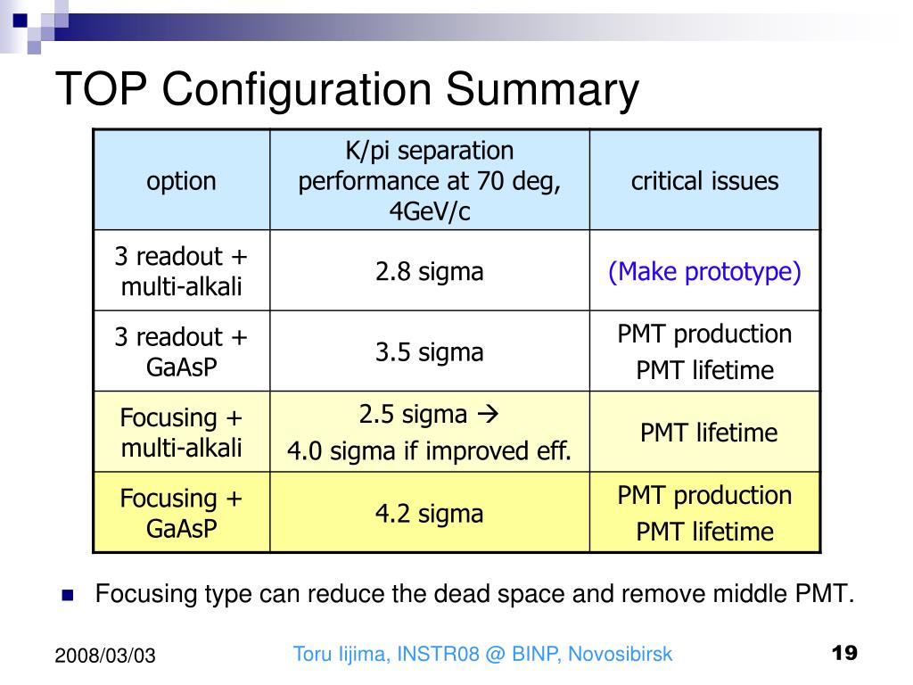 TOP Configuration Summary Focusing type can reduce the dead space and remove middle PMT. Toru Iijima, INSTR08 @ BINP, Novosibirsk
