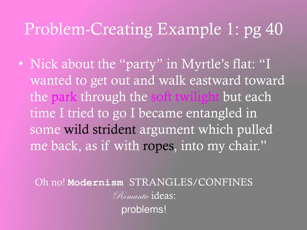 Problem-Creating Example 1: pg 40 • Nick about the “party” in Myrtle’s flat: “I wanted to get out and walk eastward toward the park through the soft twilight but each time I tried to go I became entangled in some wild strident argument which pulled me back, as if with ropes, into my chair.” Oh no! Modernism STRANGLES/CONFINES Romantic ideas: problems!