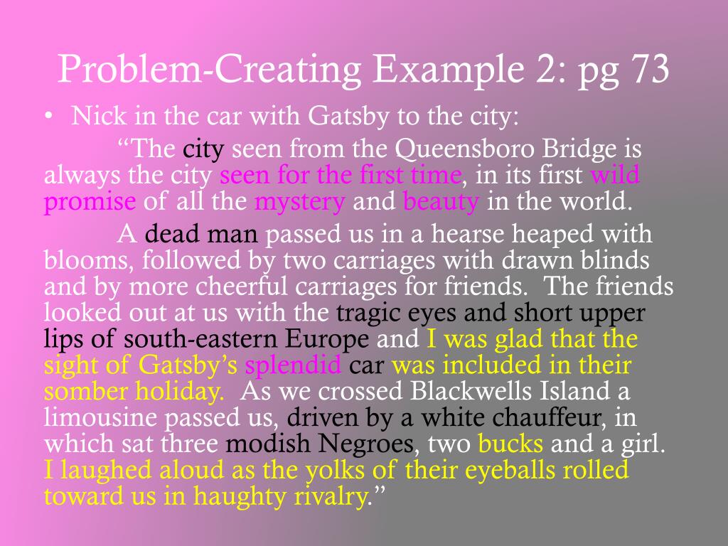 Problem-Creating Example 2: pg 73 • Nick in the car with Gatsby to the city: “The city seen from the Queensboro Bridge is always the city seen for the first time, in its first wild promise of all the mystery and beauty in the world. A dead man passed us in a hearse heaped with blooms, followed by two carriages with drawn blinds and by more cheerful carriages for friends. The friends looked out at us with the tragic eyes and short upper lips of south-eastern Europe and I was glad that the sight of Gatsby’s splendidcar was included in their somber holiday. As we crossed Blackwells Island a limousine passed us, driven by a white chauffeur, in which sat three modish Negroes, two bucks and a girl. I laughed aloud as the yolks of their eyeballs rolled toward us in haughty rivalry.”