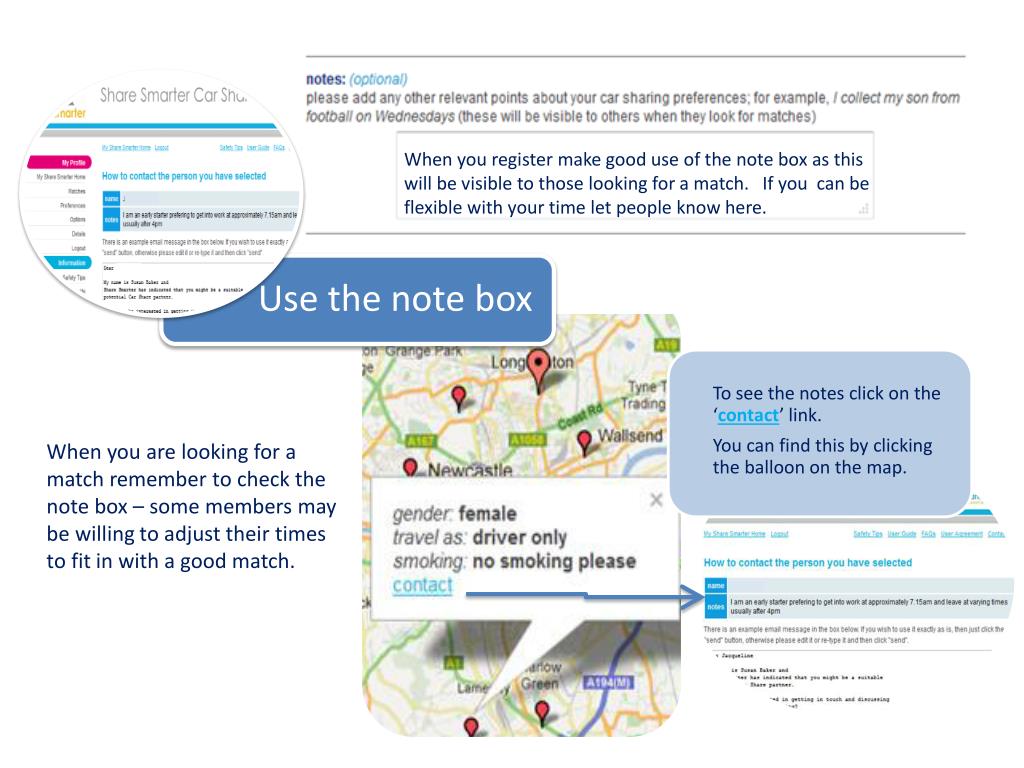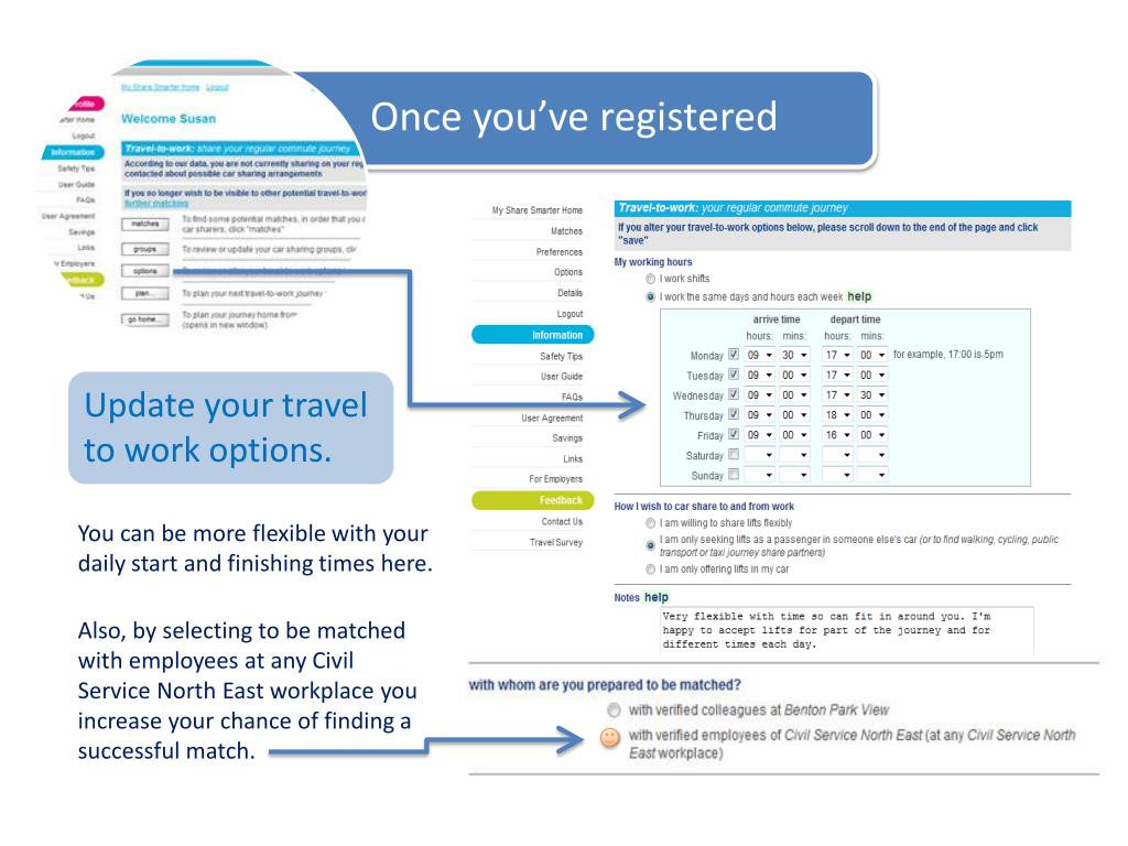 Quick tips for using the CSNE Share Smarter car share network. * www.sharesmarter.co.uk. By Susan Baker, Sustainable Development Lead, Civil Service North East Susan.baker1@hmrc.gsi.gov.uk. Once you’ve registered. Update your travel to work options.