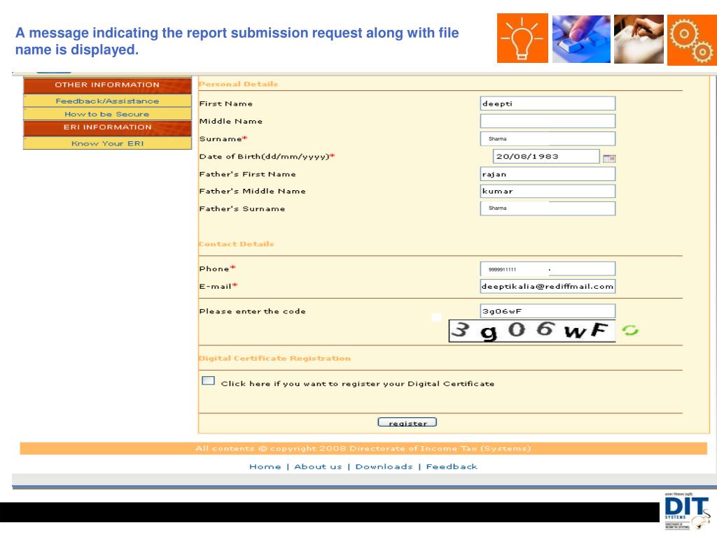 A message indicating the report submission request along with file name is displayed. Sharma Sharma 9999911111
