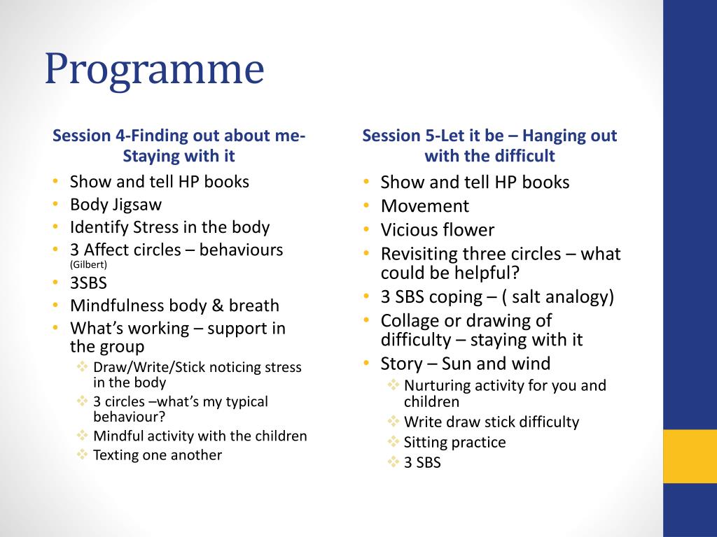 Programme Session 4-Finding out about me-Staying with it Session 5-Let it be – Hanging out with the difficult Show and tell HP books Movement Vicious flower Revisiting three circles – what could be helpful? 3 SBS coping – ( salt analogy) Collage or drawing of difficulty – staying with it Story – Sun and wind Nurturing activity for you and children Write draw stick difficulty Sitting practice 3 SBS • Show and tell HP books • Body Jigsaw • Identify Stress in the body • 3 Affect circles – behaviours (Gilbert) • 3SBS • Mindfulness body & breath • What’s working – support in the group • Draw/Write/Stick noticing stress in the body • 3 circles –what’s my typical behaviour? • Mindful activity with the children • Texting one another