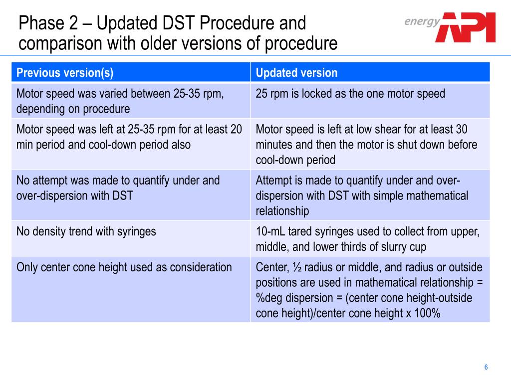 Objectives for Phase 2 Testing • Test a cement system that would show unique value of DST for performance-based cement stability evaluation • 1. Pass GO/NO testing with minimal increase in BC (less than 50BC) • 2. Pass free fluid criteria with less than 1% free fluid. • 3. Pass sedimentation test criteria with less than 5% settling • 4. Fail DST criteria with more than 5% change in density trend measured down the length of the slurry HPHT cup after DST testing • 5.Fail DST cone height measurements (greater than 0.5 inch in height) • Add test procedures and interpretation guidelines • Define motor speed at 25 rpm • Ramp to BHCT following well schedule, Stabilize for at least 30 min, Turn motor speed to 25 rpm for 30 min, Shutoff motor ensure lab to lab uniformity in low shear exposure period, cool to 190deg as soon as possible and perform measurements • Use DST cone height results for under-dispersion/over-dispersion at HPHT conditions.