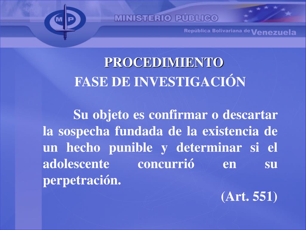PROCEDIMIENTO FASE DE INVESTIGACIÓN Su objeto es confirmar o descartar la sospecha fundada de la existencia de un hecho punible y determinar si el adolescente concurrió en su perpetración. (Art. 551)
