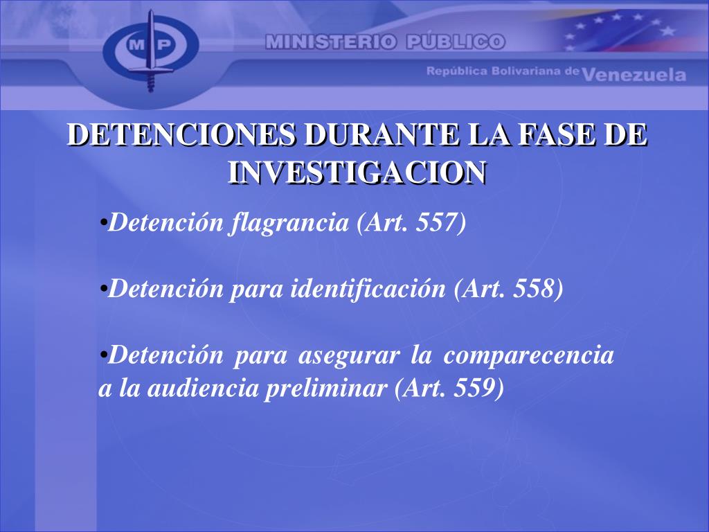 DETENCIONES DURANTE LA FASE DE INVESTIGACION • Detención flagrancia (Art. 557) • Detención para identificación (Art. 558) • Detención para asegurar la comparecencia a la audiencia preliminar (Art. 559)