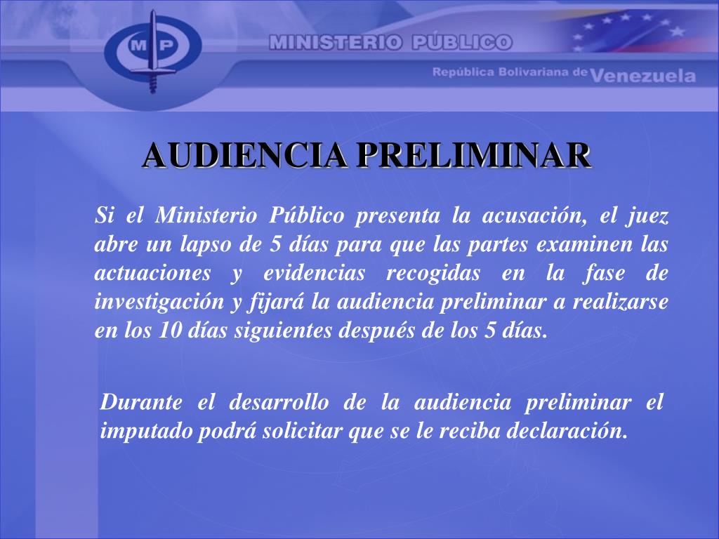 AUDIENCIA PRELIMINAR Si el Ministerio Público presenta la acusación, el juez abre un lapso de 5 días para que las partes examinen las actuaciones y evidencias recogidas en la fase de investigación y fijará la audiencia preliminar a realizarse en los 10 días siguientes después de los 5 días. Durante el desarrollo de la audiencia preliminar el imputado podrá solicitar que se le reciba declaración.