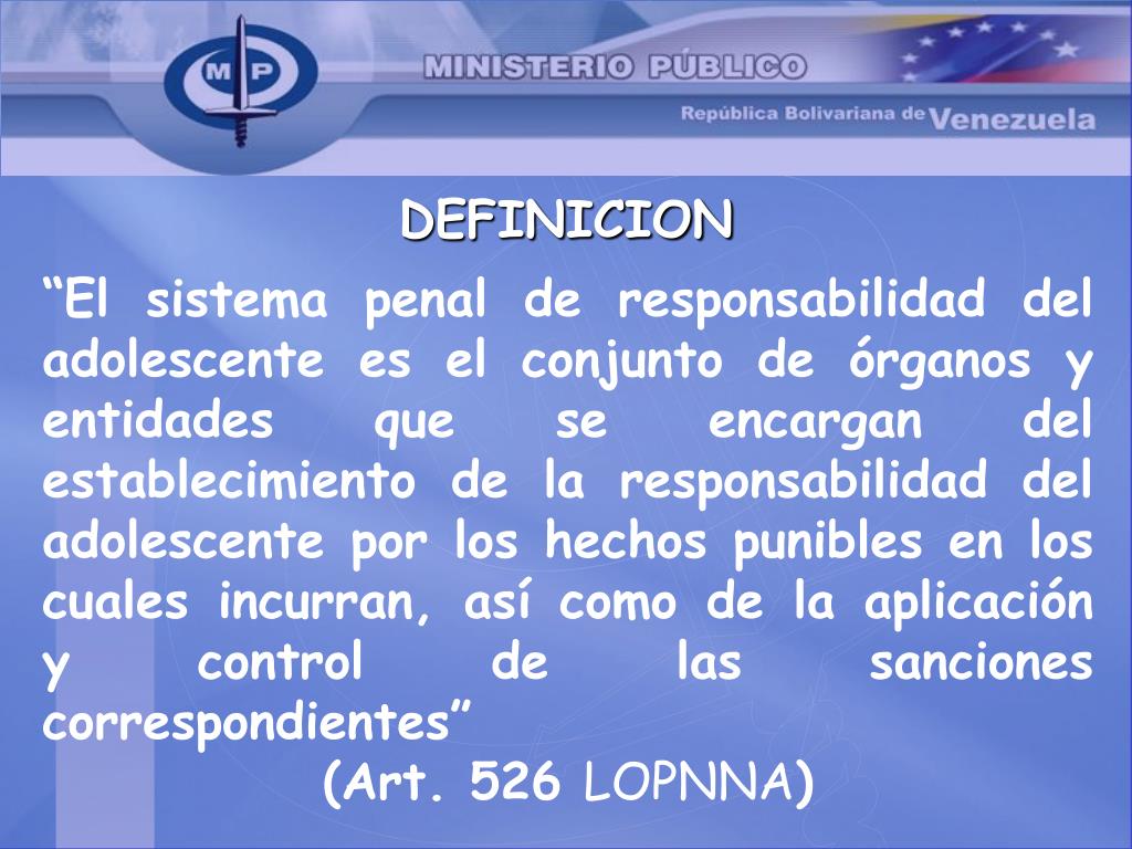 DEFINICION “El sistema penal de responsabilidad del adolescente es el conjunto de órganos y entidades que se encargan del establecimiento de la responsabilidad del adolescente por los hechos punibles en los cuales incurran, así como de la aplicación y control de las sanciones correspondientes” (Art. 526 LOPNNA)