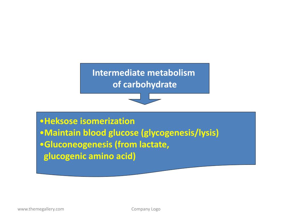 Intermediate metabolism of carbohydrate • Heksose isomerization • Maintain blood glucose (glycogenesis/lysis) • Gluconeogenesis (from lactate, • glucogenic amino acid) Company Logo