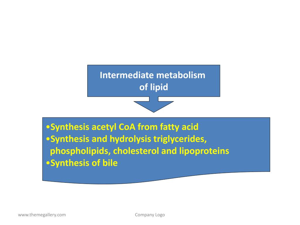 Intermediate metabolism of lipid • Synthesis acetyl CoA from fatty acid • Synthesis and hydrolysis triglycerides, • phospholipids, cholesterol and lipoproteins • Synthesis of bile Company Logo