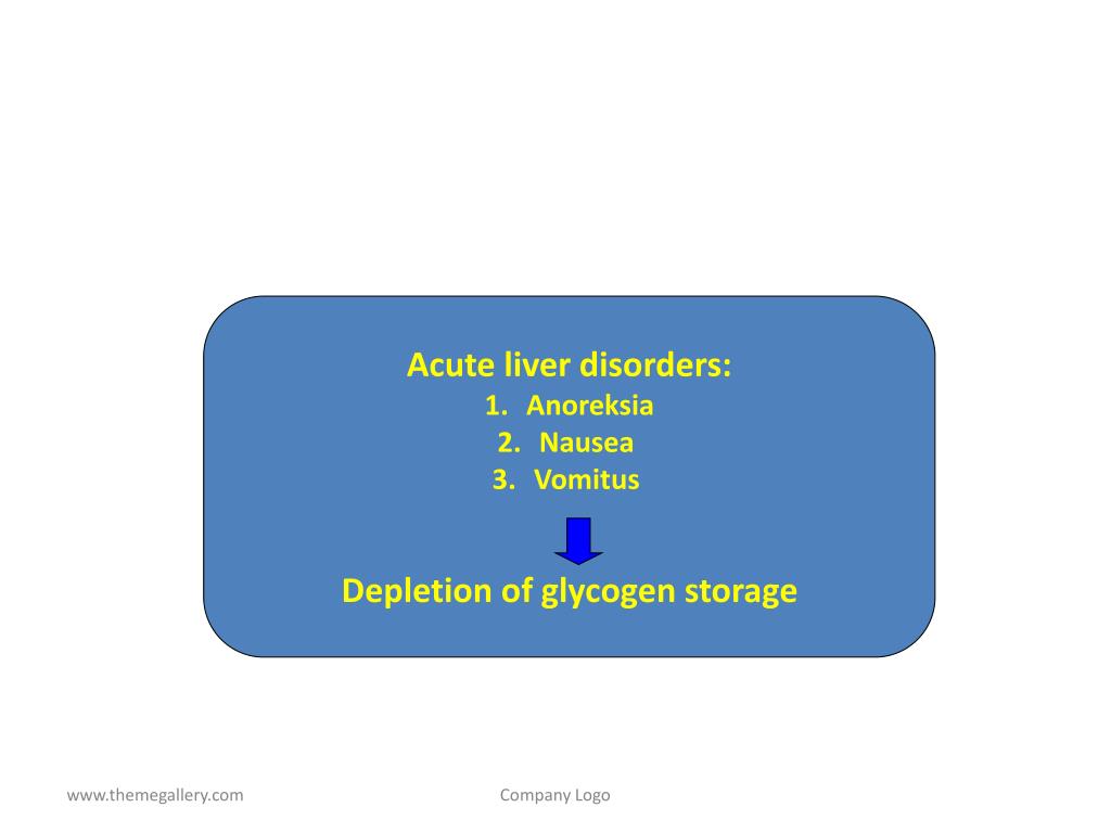 Acute liver disorders: • Anoreksia • Nausea • Vomitus • Depletion of glycogen storage Company Logo
