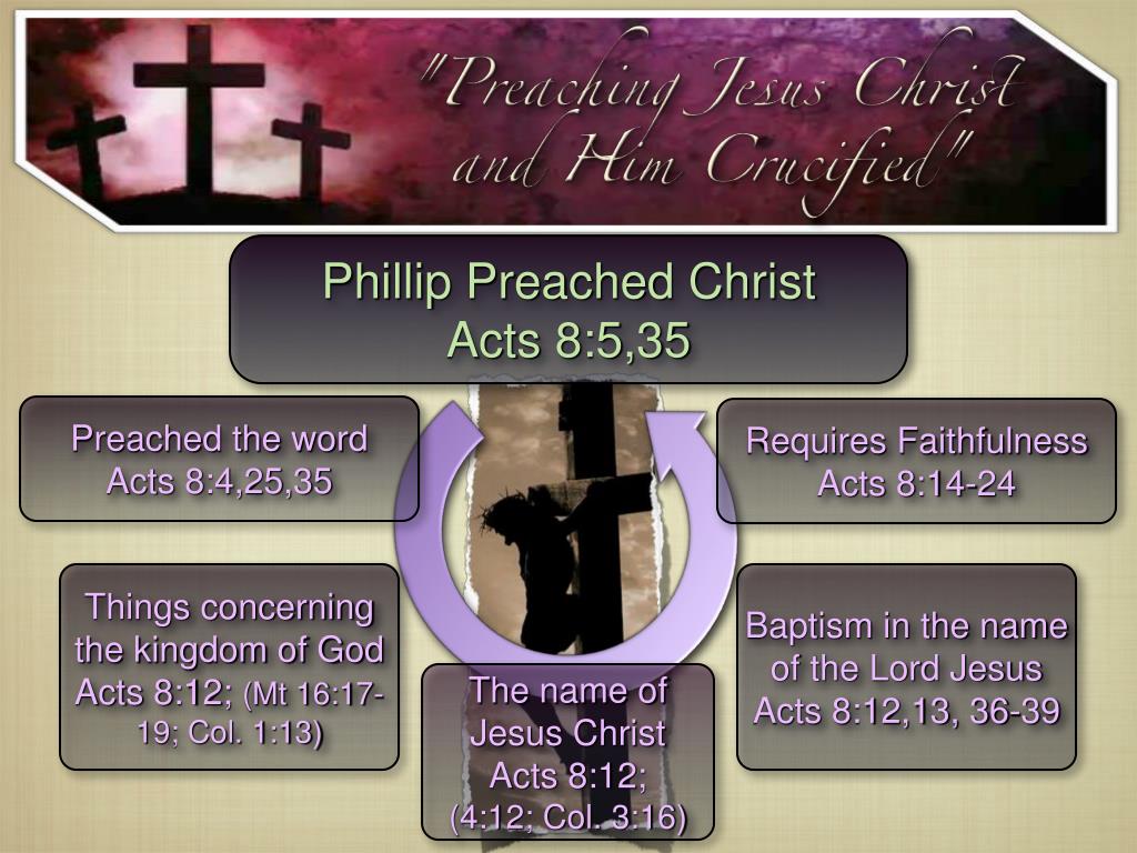 Phillip Preached Christ Acts 8:5,35 Preached the word Acts 8:4,25,35 Requires Faithfulness Acts 8:14-24 Things concerning the kingdom of God Acts 8:12; (Mt 16:17-19; Col. 1:13) Baptism in the name of the Lord Jesus Acts 8:12,13, 36-39 The name of Jesus Christ Acts 8:12; (4:12; Col. 3:16)