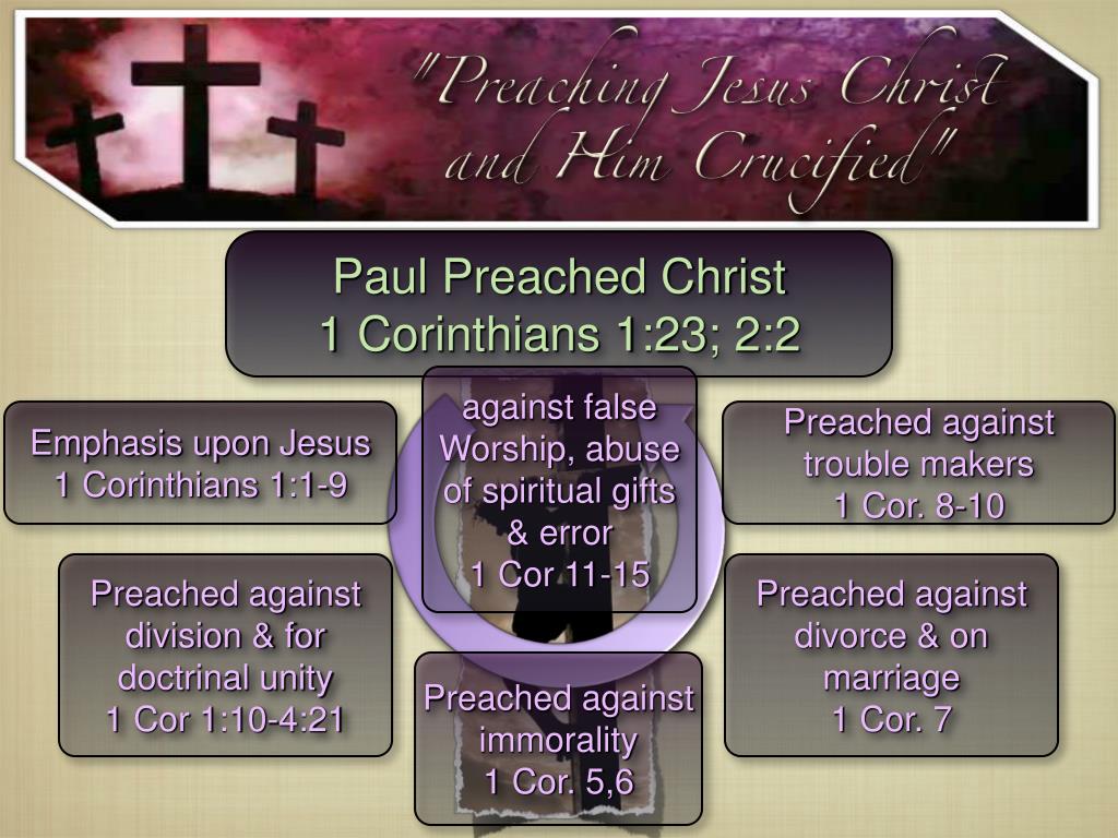 Paul Preached Christ 1 Corinthians 1:23; 2:2 against false Worship, abuse of spiritual gifts & error 1 Cor 11-15 Emphasis upon Jesus 1 Corinthians 1:1-9 Preached against trouble makers 1 Cor. 8-10 Preached against division & for doctrinal unity 1 Cor 1:10-4:21 Preached against divorce & on marriage 1 Cor. 7 Preached against immorality 1 Cor. 5,6