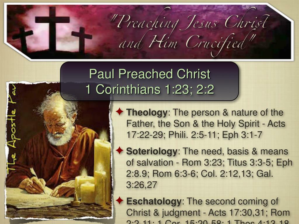 Paul Preached Christ 1 Corinthians 1:23; 2:2 • Theology: The person & nature of the Father, the Son & the Holy Spirit - Acts 17:22-29; Phili. 2:5-11; Eph 3:1-7 • Soteriology: The need, basis & means of salvation - Rom 3:23; Titus 3:3-5; Eph 2:8.9; Rom 6:3-6; Col. 2:12,13; Gal. 3:26,27 • Eschatology: The second coming of Christ & judgment - Acts 17:30,31; Rom 2:2-11; 1 Cor. 15:20-58; 1 Thes 4:13-18